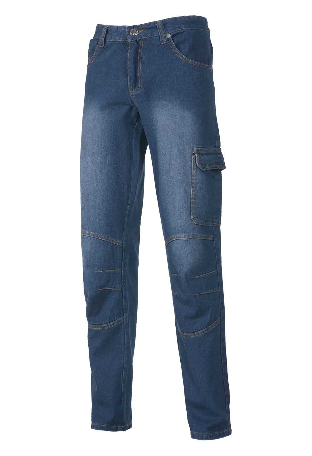 DESCRIZIONE: Pantalone jeans con due tasche a filetto e due tasche dietro. Portametro sul laterale destro. Tascone a sinistra. Ginocchiere rinforzate Chiusura con bottone e zip. Doppie cuciture nei punti di maggior sforzo.