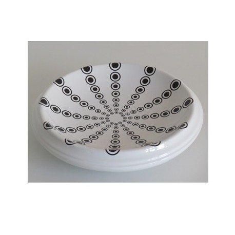 Centrotavola tondo con decoro a pois neri prodotto da Grego Ceramiche, realizzato in maiolica bianca lavorata a mano. La lunga fase di lavorazione del prodotto, che dura circa trentasei ore, viene seguita e controllata da personale altamente specializzato fino alla fase ultima dell’imballo in scatola doppia e polistirolo che garantisce la massima sicurezza nel trasporto. Tutto il materiale utilizzato per la produzione dell’oggetto è di origine Italiana e tutto il processo produttivo è effettuato in Azienda. L’oggetto per il suo design originale, può essere adattabile a tutti i tipi di arredamento e ad ogni ambiente.