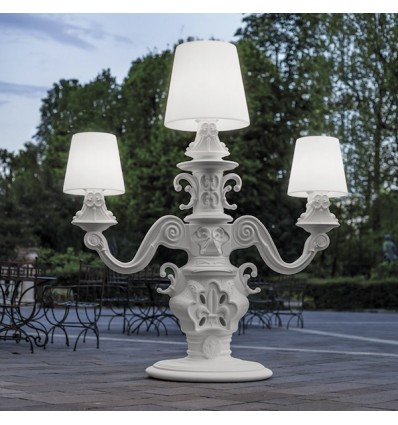 King of Love è una lampada da terra della collezione Slide, dal design ricco di dettagli tipico dello stile barocco. Di forte impatto visivo, esalta gli spazi con eleganza e stile. I paralumi bianchi sono impreziositi da una texture con decoro classico, molto gradevole anche al tatto. E’ prodotta in materiale termoplastico di ultima generazione, della famiglia dei polimeri sintetici. I paralume dello stesso materiale sono stampati con la tecnica rotativa. Molto resistente alle abrasioni ed agli urti. Per le sue peculiarità estetiche, è ideale per completare arredamenti di grandi spazi domestici, sale da pranzo, living o saloni, giardini o bordo piscina. Altrettanto adatta hall o dehors di hotel, ristoranti, di ville utilizzate per eventi e cerimonie. E’ corredata di tutte le certificazioni relative alla normativa Europea. Alimentata a mezzo cavo con protezione IP55. Consigliamo di inserire negli appositi tre bulbi una lampada a risparmio energetico da 25W cadauna (non incluse). King of Love è prodotto nei colori standard : Bianco Latte, Nero, Grigio Elefante, Marrone Cioccolato, Grigio Argilla, Grigio Tortora, Blu Polvere, Verde Malva, Verde Lime, Giallo Zafferano, Arancio Zucca, Rosso Fiamma, Fucsia. Oppure nelle finiture laccate dall’effetto lucido o opaco : Bianco Absolute, Nero Glamour, Grigio Vanity, Avorio Charming, Rosso Supreme, Oro Metallizzato, Argento Metallizzato, Rame Metallizzato.