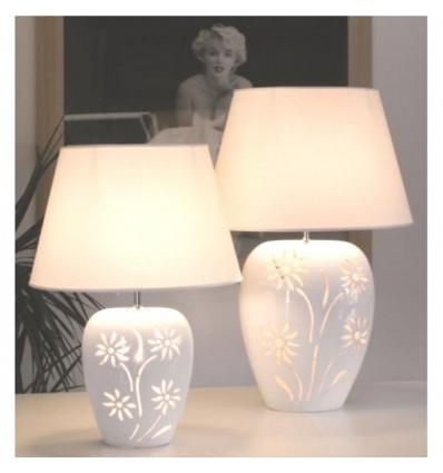 Lampada dal design originale e creativo di forma ovale completa di paralume in seta, prodotta in maiolica bianca. Collezione Grego Ceramiche. La realizzazione dell’oggetto viene effettuata in diverse fasi, dalla realizzazione del calco/stampo in gesso con la conseguente colatura del liquido ceramico, alle varie fasi di cottura ad alta temperatura (circa 1000°) e le varie rifiniture compreso la traforatura, tutto con tecniche eseguite a mano da abili maestri modellatori. Le suddette fasi di lavorazioni eseguite manualmente rendono il prodotto unico, di alta qualità e pregio, adattabile a qualsiasi ambiente e tipo di arredamento.