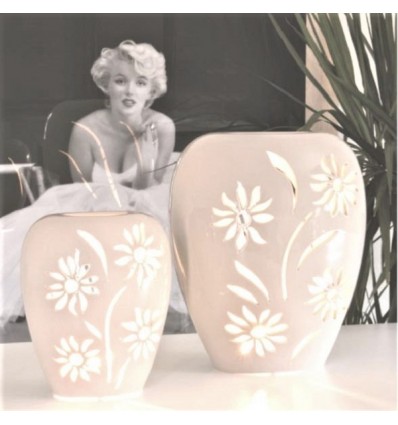 Lampada dal design originale e creativo con traforatura motivi floreali, realizzata in maiolica bianca. Collezione Grego Ceramiche. La realizzazione dell’oggetto viene effettuata in diverse fasi, dalla realizzazione del calco/stampo in gesso con la conseguente colatura del ceramico liquido, alla traforatura che realizza il motivo floreale, alle varie fasi di cottura ad alta temperatura (circa 1000°) ed infine le rifiniture, tutto con tecniche eseguite a mano da abili maestri modellatori. La lavorazione a mano rende l’oggetto unico, di alta qualità e pregio, adattabile a qualsiasi ambiente e tipo di arredamento.