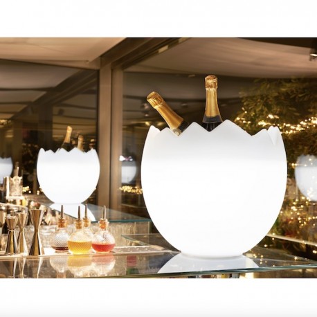 Secchiello porta ghiaccio Kalimera, dalla forma di un guscio di uovo, è il protagonista di brindisi ironici e giocosi. Dona un tocco informale, di colore e luminosità senza rinunciare all’eleganza. E’ realizzato con la tecnica dello stampaggio rotazionale, in materiale termoplastico di ultima generazione, resistente alla corrosione, alle abrasioni ed agli urti. Può contenere materiali liquidi senza subire alterazioni. E’ ideale da utilizzare in ambienti, sia interni che esterni ad uso privato o di locali pubblici destinati ad eventi o cerimonie. E’ corredato di tutte le certificazioni relative alle normative comunitarie, anche nella versione luminosa. La versione luminosa ha le seguenti caratteristiche: è per uso interno ed esterno, dotato di sistema di illuminazione a LED 3W RGB a batteria ricaricabile, senza fili e comando a distanza. Protezione IP55. Kalimera è disponibile nei colori standard: Bianco Latte, Nero, Grigio Elefante, Marrone Cioccolato, Grigio Argilla, Grigio Tortora, Blu Polvere, Verde Malva, Verde Lime, Giallo Zafferano, Arancio Zucca, Rosso Fiamma e Fucsia. Anche nei colori laccati, con effetto lucido o opaco : Bianco Absolute, Nero Glamour, Grigio Vanity, Avorio Charming, Rosso Supreme, Oro Metallizzato, Argento Metallizzato e Rame Metallizzato. In fine nella versione luminosa di colore Bianco.