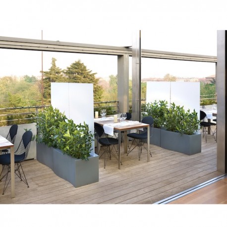 Vaso Privè dalla linea sinuosa, se completato con il pannello in plexiglas, disponibile su richiesta, diventa un elegante separé e fornisce la soluzione ideale per modulare gli spazi. Realizzato con la tecnica dello stampaggio rotazionale, in materiale termoplastico, molto resistente alla corrosione, alle abrasioni, agli urti ed agli agenti atmosferici. Può contenere terriccio o materiali liquidi ed essere facilmente lavabile con acqua e sapone neutro, senza subire alterazioni. Il pannello di separazione è in plexiglas da mm 8 incolore satinato. Per la sua vesatilità è particolarmente indicato per completare gli arredi di spazi, sia interni che esterni di casa, zona living, terrazzo o balcone. Altrettanto adatta ad ambienti di pubblici esercizi, hall di hotel, sale o terrazzi di ville dedicate a eventi o cerimonie, ristoranti, bar o ancora per hall o sale di attesa di aziende o di studi professionali, dall’atmosfera raffinata. La versione luminosa ha le seguenti caratteristiche: è per uso interno o esterno, alimentato a mezzo cavo – Protezione IP55. Si raccomanda di inserire, negli appositi due bulbi, una lampada a risparmio energetico da 15W cadauna (non inclusa) Privé è disponibile nei colori standard: Bianco Latte, Nero, Grigio Elefante, Marrone Cioccolato, Grigio Argilla, Grigio Tortora, Blu Polvere, Verde Malva, Verde Lime, Giallo Zafferano, Arancio Zucca, Rosso Fiamma e Fucsia. Anche nei colori laccati, con effetto lucido o opaco : Bianco Absolute, Nero Glamour, Grigio Vanity, Avorio Charming, Rosso Supreme, Oro Metallizzato, Argento Metallizzato e Rame Metallizzato. In fine nella versione luminosa di colore Bianco.