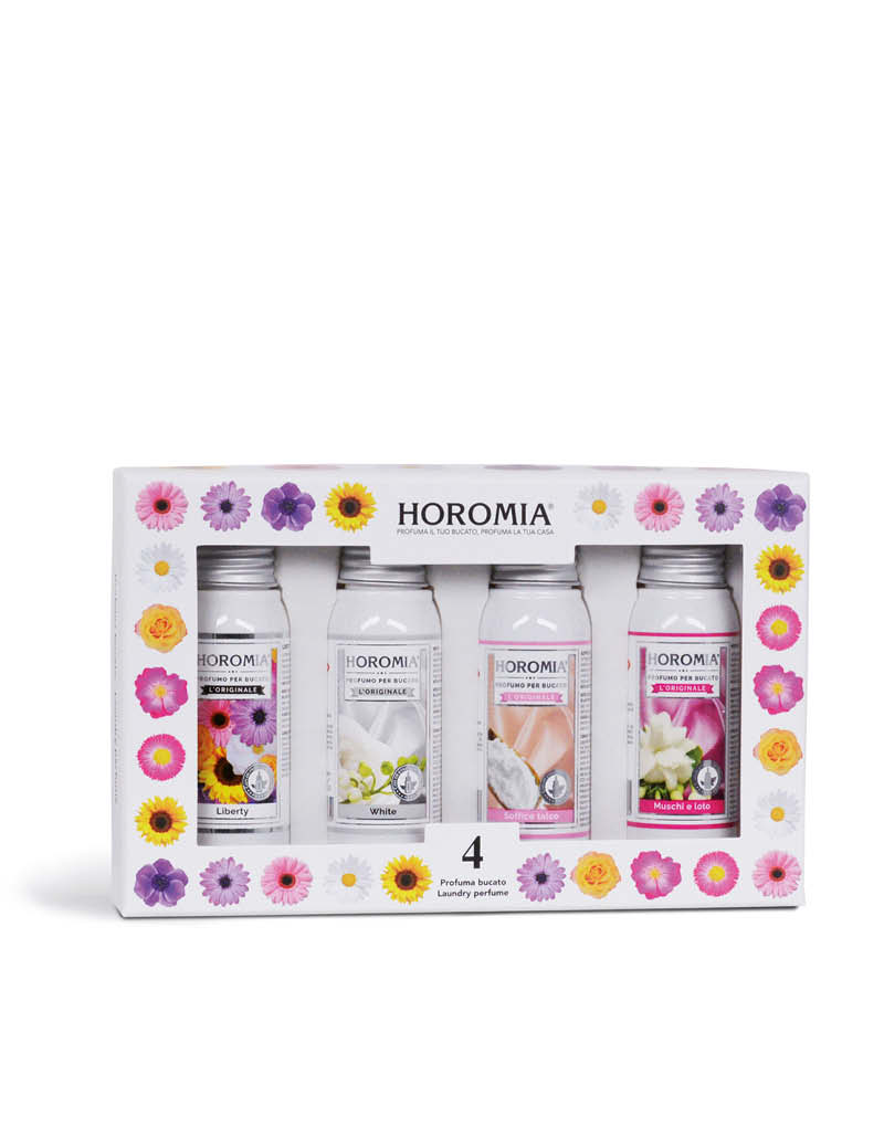 HORO4 Cofanetto contenente quattro Profuma bucato da 50ml. Liberty, White, Soffice Talco, Muschi e Loto. Le Essenze Horomia sono molto più di semplici profumi per bucato , dedicate a chi ama un tocco di stile in più, bastano poche gocce aggiunte in lavatrice, per ottenere capi profumati in grado di regalarvi sensazioni di benessere per tutta la giornata. MODO D’USO : prodotto concentrato. Agitare prima dell’uso. IN LAVATRICE : versare 10/20ml di prodotto nella vaschetta della lavatrice dedicata all’ultimo risciacquo, a seconda dell’intensità del profumo che si vuole ottenere. Rimuovere immediatamente il prodotto fuoriuscito. A MANO : aggiungere 10/20 ml di prodotto ogni 5 litri d’acqua nell’ultimo risciacquo utilizzando guanti protettivi.