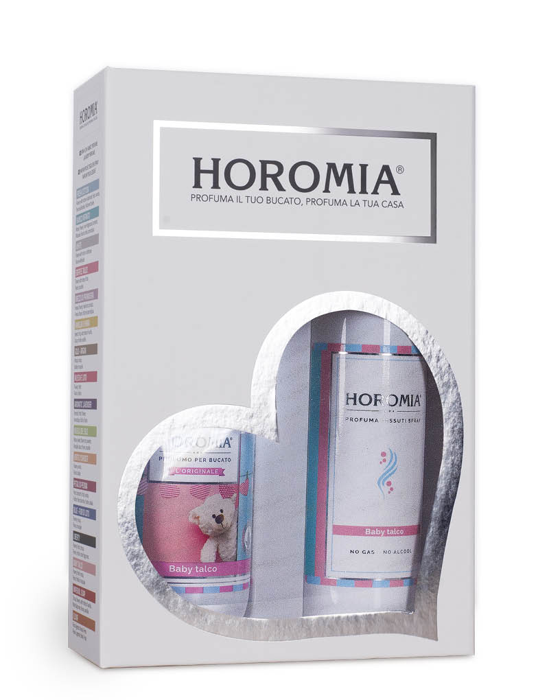 HOROTWINS è una confezione regalo contenente il profuma bucato Horomia e il profumo spray per tessuti della stessa fragranza. DEO TESSUTI SPRAY BABY TALCO 250ml Grazie alla sua innovativa miscela studiata SENZA l’aggiunta di ALCOOL e GAS è adatta a tutti i tipi di tessuti, anche quelli più delicati come seta e cachemire, non macchia e non lascia aloni. Contiene inoltre molecole che NEUTRALIZZANO i cattivi odori. Ideale per tendaggi, interni auto, tappezzerie, e per tutto il tuo bucato. Lasciati avvolgere dalle fragranze Horomia, la tua vita sarà persuasa da emozioni profumate che non vorrai mai più lasciare. MODO D’USO : Agitare prima dell’uso. Bastano pochi spruzzi direttamente sui tessuti ad una distanza circa di 20 cm per donare un’avvolgente sensazione di freschezza e pulito, che dura nel tempo. PROFUMA BUCATO BABY TALCO 250ml Baby Talco è la fragranza che coccola i tuoi capi con un profumo soffice e delicato, ispirato alla dolcezza dell’infanzia e alla purezza del talco. Un’esperienza sensoriale avvolgente, perfetta per chi cerca un profumatore per bucato caldo, pulito e rilassante. L’apertura è un bouquet elegante e vellutato, con eliotropio, fiori d’arancio e gelsomino che donano alla composizione una freschezza fiorita e luminosa. Nel cuore, le note poudré dell’iris concreta si fondono con il ciclamino e un accento speziato di zenzero, per una scia equilibrata e raffinata. Il fondo è caldo e rassicurante, con polvere di talco, muschio bianco e legno di patchouli , che conferiscono profondità, comfort e persistenza. Perfetto per chi ama i profumi talcati e delicati. Ideale per il bucato di tutta la famiglia, anche per capi delicati. Fragranza a lunga durata con effetto coccola su ogni tessuto. Con Baby Talco , ogni lavaggio è un gesto di dolcezza e benessere. Le Essenze Horomia sono molto più di semplici profumi per bucato , dedicate a chi ama un tocco di stile in più, bastano poche gocce aggiunte in lavatrice, per ottenere capi profumati in grado di regalarvi sensazioni di benessere per tutta la giornata. Disponibili in formato da 250ml. MODO D’USO : prodotto concentrato. Agitare prima dell’uso. Rimuovere tempestivamente eventuale prodotto fuoriuscito. Non stendere il bucato al sole. IN LAVATRICE : versare 10/20ml di prodotto nella vaschetta della lavatrice dedicata all’ultimo risciacquo, a seconda dell’intensità del profumo che si vuole ottenere. A MANO : aggiungere 10/20 ml di prodotto ogni 5 litri d’acqua nell’ultimo risciacquo utilizzando guanti protettivi. NOTA OLFATTIVA: DI TESTA: eliotropio, fiori d’arancio, gelsomino. DI CUORE: iris concreta, ciclamino, zenzero, scorze. DI FONDO: polvere di talco, muschio bianco, legno di patchouli.