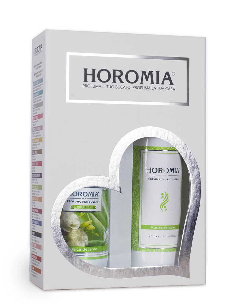 HOROTWINS è una confezione regalo contenente il profuma bucato Horomia e il profumo spray per tessuti della stessa fragranza. DEO TESSUTI SPRAY MUSICA DEL SOLE 250ml Grazie alla sua innovativa miscela studiata SENZA l’aggiunta di ALCOOL e GAS è adatta a tutti i tipi di tessuti, anche quelli più delicati come seta e cachemire, non macchia e non lascia aloni. Contiene inoltre molecole che NEUTRALIZZANO i cattivi odori. Ideale per tendaggi, interni auto, tappezzerie, e per tutto il tuo bucato. Lasciati avvolgere dalle fragranze Horomia, la tua vita sarà persuasa da emozioni profumate che non vorrai mai più lasciare. MODO D’USO : Agitare prima dell’uso. Bastano pochi spruzzi direttamente sui tessuti ad una distanza circa di 20 cm per donare un’avvolgente sensazione di freschezza e pulito, che dura nel tempo. PROFUMA BUCATO MUSICA DEL SOLE 250ml Lasciati avvolgere dalla luce e dall’energia di Musica del Sole , il profumatore per bucato che celebra la bellezza delle giornate luminose con una fragranza delicata, pulita e solare. Un’essenza equilibrata e raffinata, perfetta per chi desidera un bucato profumato, fresco e accogliente. Lasciati avvolgere dalla luce e dall’energia di Musica del Sole , il profumatore per bucato che celebra la bellezza delle giornate luminose con una fragranza delicata, pulita e solare. Un’essenza equilibrata e raffinata, perfetta per chi desidera un bucato profumato, fresco e accogliente. La fragranza si apre con la dolcezza vellutata della pesca , che regala una nota fruttata e luminosa. Nel cuore, la delicatezza della rosa si fonde con l’aroma poudré dell’ eliotropio , creando un accordo elegante e soave. A completare la composizione, il fondo morbido e persistente del muschio bianco e del legno di cedro, per una sensazione di freschezza naturale che dura a lungo sui tessuti. Perfetto per profumare il bucato in lavatrice e nell’asciugatrice. Fragranza delicata e non invasiva, adatta a tutta la famiglia. Effetto long lasting su tutti i tipi di tessuto. Con Musica del Sole , ogni lavaggio sprigiona un’armonia di profumi che evocano pulizia, luce e serenità. Le Essenze Horomia sono molto più di semplici profumi per bucato , dedicate a chi ama un tocco di stile in più, bastano poche gocce aggiunte in lavatrice, per ottenere capi profumati in grado di regalarvi sensazioni di benessere per tutta la giornata. MODO D’USO : prodotto concentrato. Agitare prima dell’uso. Rimuovere tempestivamente eventuale prodotto fuoriuscito. Non stendere il bucato al sole. IN LAVATRICE : versare 10/20 ml di prodotto nella vaschetta della lavatrice dedicata all’ultimo risciacquo, a seconda dell’intensità del profumo che si vuole ottenere. IN ASCIUGATRICE : versare qualche goccia su un fazzoletto o un pezzo di tessuto e posizionarlo all’interno dell’asciugatrice. A MANO : aggiungere 10/20 ml di prodotto ogni 5 litri d’acqua nell’ultimo risciacquo utilizzando guanti protettivi. NOTA OLFATTIVA : DI TESTA: pesca. DI CUORE: rosa, Eliotropio. DI FONDO: muschio bianco, legno cedro.