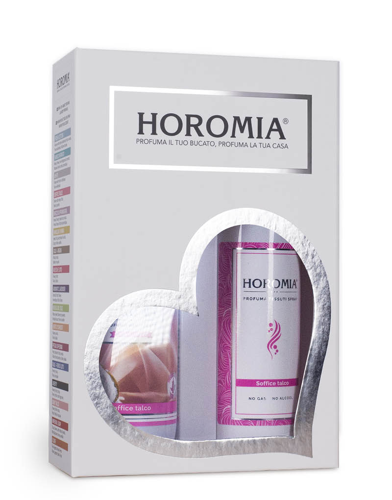 HOROTWINS è una confezione regalo contenente il profuma bucato Horomia e il profumo spray per tessuti della stessa fragranza. DEO TESSUTI SPRAY SOFFICE E TALCO 250ml Grazie alla sua innovativa miscela studiata SENZA l’aggiunta di ALCOOL e GAS è adatta a tutti i tipi di tessuti, anche quelli più delicati come seta e cachemire, non macchia e non lascia aloni. Contiene inoltre molecole che NEUTRALIZZANO i cattivi odori. Ideale per tendaggi, interni auto, tappezzerie, e per tutto il tuo bucato. Lasciati avvolgere dalle fragranze Horomia, la tua vita sarà persuasa da emozioni profumate che non vorrai mai più lasciare. MODO D’USO : Agitare prima dell’uso. Bastano pochi spruzzi direttamente sui tessuti ad una distanza circa di 20 cm per donare un’avvolgente sensazione di freschezza e pulito, che dura nel tempo. PROFUMA BUCATO SOFFICE E TALCO 250ml Regala ai tuoi capi una carezza di pulito con Soffice Talco , il profumatore per bucato dal profumo talcato, avvolgente e raffinato. Una fragranza iconica, ispirata al profumo del talco e della biancheria fresca, pensata per chi ama lasensazione di pulito duraturo e discreto. Le Essenze Horomia sono molto più di semplici profumi per bucato , dedicate alle donne che amano un tocco di stile in più, bastano poche gocce aggiunte in lavatrice, per ottenere capi profumati in grado di regalarvi sensazioni di benessere per tutta la giornata. Disponibili in formato da 50, 250 e 500 ml. MODO D’USO : prodotto concentrato. Agitare prima dell’uso. Rimuovere tempestivamente eventuale prodotto fuoriuscito. Non stendere il bucato al sole. IN LAVATRICE : versare 10/20ml di prodotto nella vaschetta della lavatrice dedicata all’ultimo risciacquo, a seconda dell’intensità del profumo che si vuole ottenere. A MANO : aggiungere 10/20 ml di prodotto ogni 5 litri d’acqua nell’ultimo risciacquo utilizzando guanti protettivi. NOTA OLFATTIVA : DI TESTA: note aldeidate, mughetto. DI CUORE: geranio, gelsomino. DI FONDO: muschio bianco.
