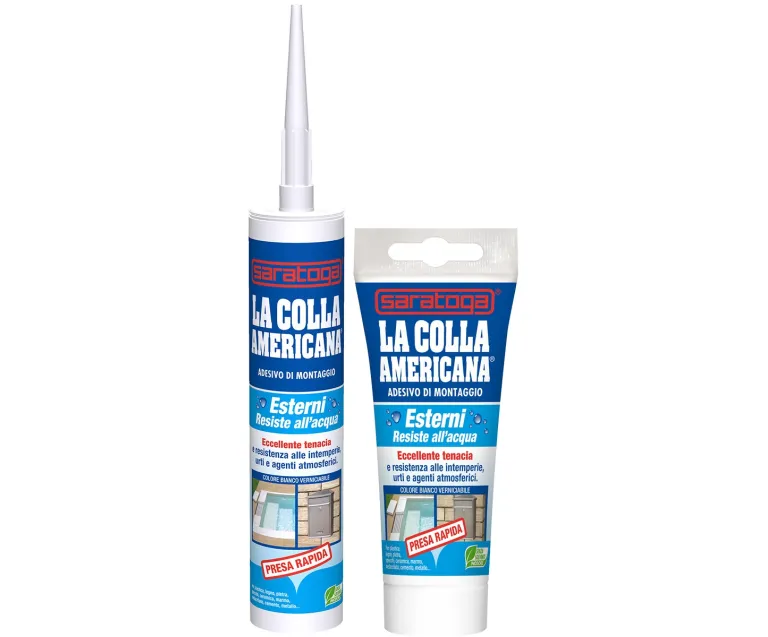 LA COLLA AMERICANA ESTERNI è l’adesivo di montaggio bianco a base di polimeri ibridi, ha presa rapida, e forte tenuta finale. L’altissima presa immediata e la sua tenuta finale la rendono ideale per sostituire viti, chiodi e tasselli. Ha ottima adesione anche sulle superfici umide, ottima resistenza alle intemperie, all’ambiente marino, alle vibrazioni, a oli minerali, solventi, acidi e alcali. Senza solventi e inodore, assicura velocemente una eccezionale tenuta. Elevato potere riempitivo: riempie spazi tra superfici irregolari e colma piccole fessure. Sovraverniciabile da asciutta (verificare la compatibilità della vernice con un pre-test), mantiene elasticità elevata nel tempo, anche se sottoposto a vibrazioni. Disponibile in: Cartuccia (450 g) Tubone (200 g)