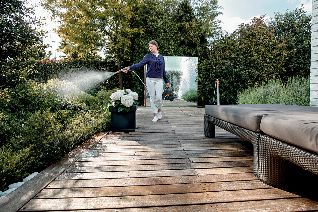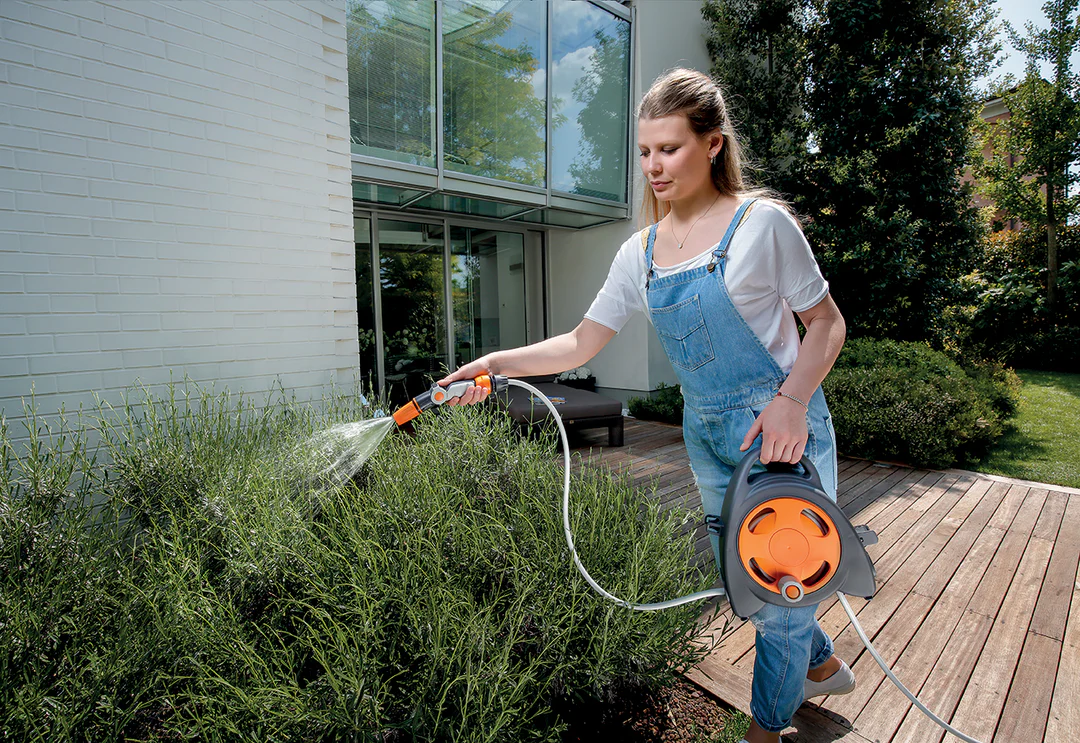 Il nuovo avvolgitubo in versione mini è ideale per irrigare piante, fiori e vasi collocati su terrazzi, balconi, verande e giardini di piccole dimensioni. Grazie alla duplice modalità di utilizzo, appoggiabile a terra o trasportabile, risulta estremamente pratico durante l’uso poiché compatto, leggero e dal nuovo design accattivante, rendendo i momenti all’aria aperta ancora più piacevoli. • 11,5 metri di tubo flessibile e trecciato (10 m interni riavvolgibili + 1,5 m esterni) • 2 raccordi ad aggancio rapido • lancia ergonomica a portata variabile 3 Jet • presa rubinetto indoor-outdoor da ¾”, ideale per l’allacciamento ad ogni tipo di rubinetto, anche da interno (es: cucina, bagno, lavanderia…)