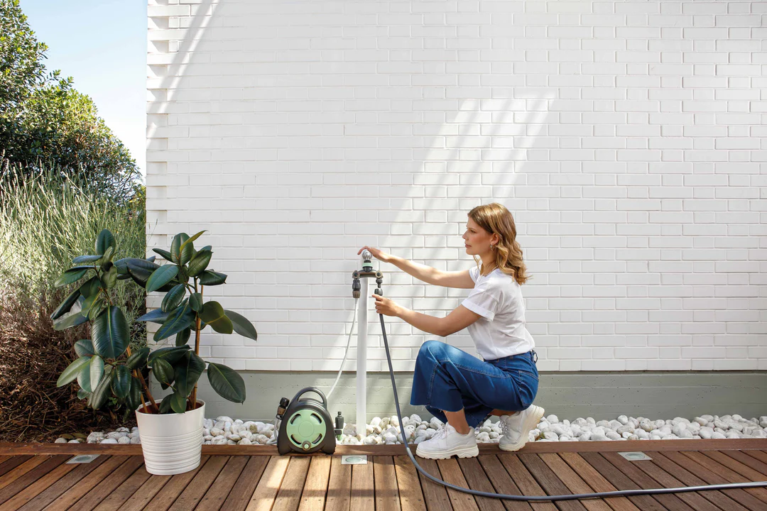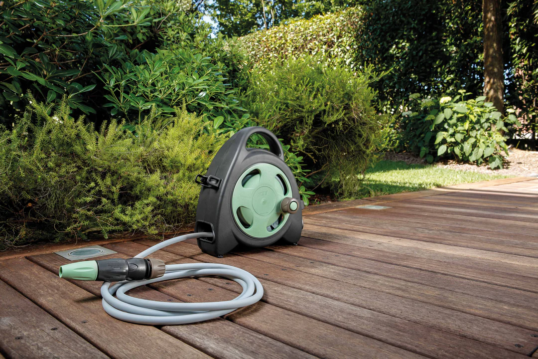 Il nuovo avvolgitubo in versione mini è ideale per irrigare piante, fiori e vasi collocati su terrazzi, balconi, verande e giardini di piccole dimensioni. Grazie alla duplice modalità di utilizzo, appoggiabile a terra o trasportabile, risulta estremamente pratico durante l’uso poiché compatto, leggero e dal nuovo design accattivante, rendendo i momenti all’aria aperta ancora più piacevoli. • 10 metri di tubo flessibile e trecciato (8,5 m interni riavvolgibili + 1,5 m esterni) • 2 raccordi ad aggancio rapido • lancia a spruzzo regolabile media • presa rubinetto da 3/4”