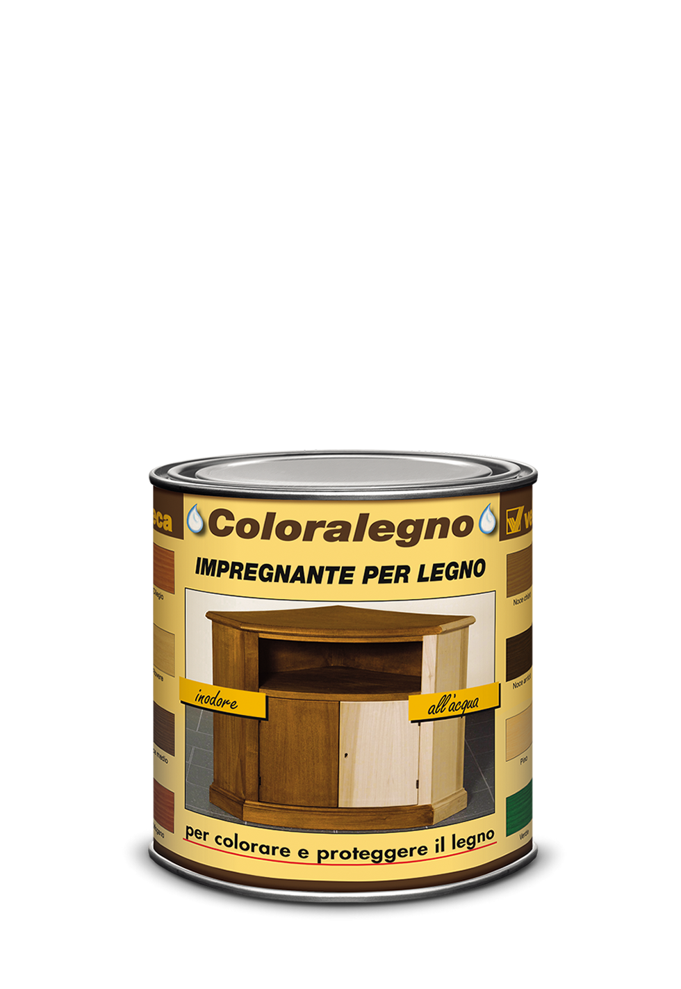 A base acqua. Inodore. Coloralegno è un prodotto specifico indicato per colorare e proteggere tutti i manufatti di legno destinati sia all’interno che all’esterno della casa (mobili, mensole e oggetti di legno in genere). Aderisce perfettamente su qualsiasi superficie, penetra in profondità e non forma spessore. Coloralegno è un impregnante formulato con particolari materie prime che trasformano facilmente il legno nella tonalità di colore desiderata, senza coprire le venature naturali del legno stesso. Coloralegno è un colorante resistente all’esposizione diretta alla luce e ai raggi U.V . Coloralegno rende la superficie semi-lucida e dall’aspetto naturale. Se si desidera una superficie più piena e morbida al tatto, applicare anche una mano di turapori ( Acrivel ) e una mano di vernice di finitura all’acqua ( Mobil-H lucida, satinata oppure opaca ). Coloralegno è un impregnante per legno “inodore” ed é quindi utilizzabile anche all’interno senza particolari precauzioni.